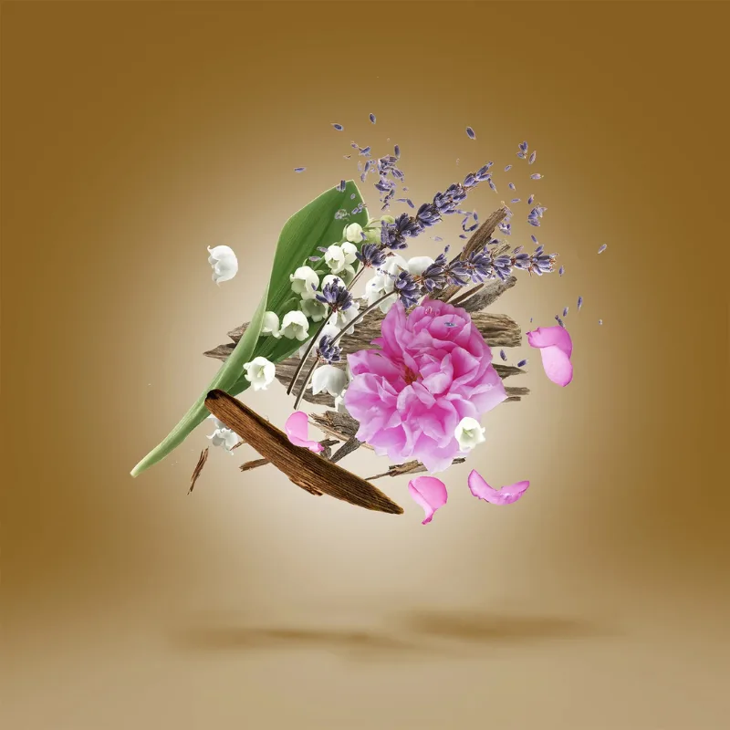 Notes de cœur : Cèdre, Rose, Bois de Oud, Muguet